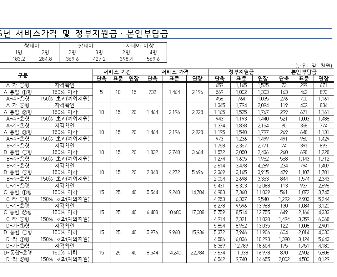 (주 5일)1주 629,500원 (60,000원) 2주 1,228,000원 (90,000원) 3주 1,827,500원 (120,000원) 4주 2,426,000원 (150,000원) 쌍둥이 추가요금 : 30,000원 공휴일 1일 금액의 150% 명절 추가요금 5만원